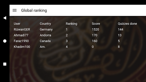 This is a quiz app about Islam Ahmadiyyat. The user creates an account which allows to compete him- or herself with other users.