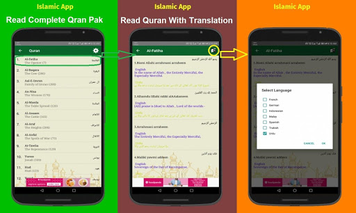 - Read Quran Karim in different languages like English, French, German, Indonesian, Malay, Spanish, Turkish and Urdu.