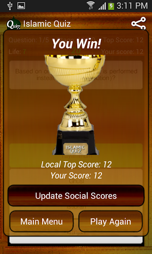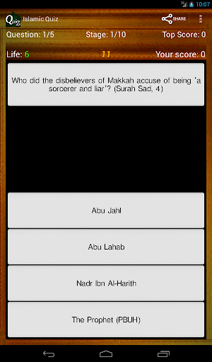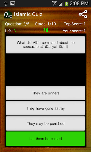 Islamic Quiz contains Ten stages, once you complete all of the stages you will get the Cup. Continuously answering 3, 4 and 5 right answers will give you 1, 2 and 3 bonus points respectively and it will also increase 1 life. Answering 1, 2 and 3 wrong answers will decrease 1, 2 and 3 lives respectively. Entering a wrong answer will not quit you out from the game, rather it will decrease the lives and once the life becomes zero, the game will be over.
