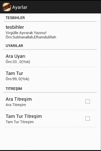 You can sett he tasbeeh words, sub-alert count and whole tour count as you wish. (Example: sub-alert=33,Whole Tour:99 Tasbeehs:"Subhanallah,Elhamdulillah,Allahu Ekber") as in pray.