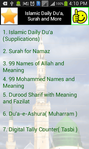 and More in English and Arabic for e.g. Ramadan or Ramzan Du'a (Supplication) for Sehri, Iftari, Dua for Wealth and Prosperity, Dua for Studying, Dua for Parent's, Dua(Supplication) before going to Sleep and many more... , Durood Shareef with Fazilat and Meanings, Surah for Namaz, 99 Names of Allah with Meanings, 99 Names of Mohammed with Meaning, Dua e Ashura (Muharram) and DIGITAL TALLY COUNTER(TASBI).