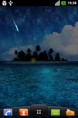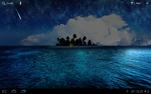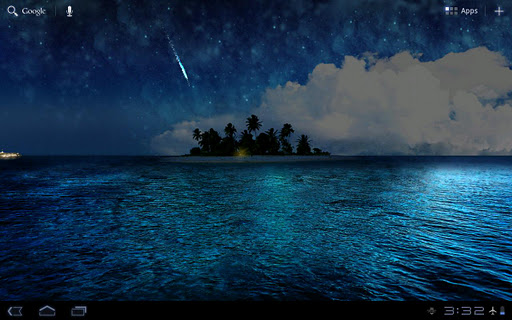Sea landscape with floating clouds over the island, shooting stars, ships cleaving the sea smooth and other animated events. The day gives way to the night depending on what time it is. Animated Sea Island Landscape Light Your Android Screen – AppEggs.com