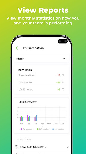 • New! View how you and your team are performing with the updated reporting feature. You can now track how many samples your team members have sent, as well as how many DTs and LCs they have enrolled. In the new reporting feature, you can now filter and compare you and your team’s progress from month to month.