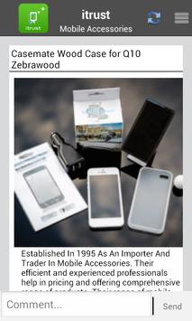 Itrust Accessories provides a wide range of cell phone accessories at extremely low rate. We even have a special Price Guarantee so we can match the lowest prices available on phone accessories, and then discount them even further. Take a look at our selection and find the newest accessories for the latest cell phones at the best prices. Application having features to update the user about the latest mobile accessories coming in market and allow users to send the feedback and request for purchase.