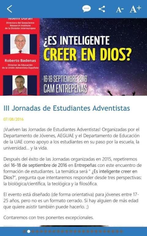 With this application you can connect with your friends from Spain Adventists, view photos and videos of recent events, calendar of upcoming events and the latest news from JAE.