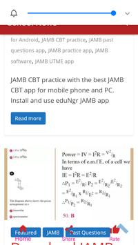 Here are some of the features of this JAMB app, and they are all FREE: JAMB CBT JAMB News Syllabus Brochure * JAMB * - E-Facility - CAPS - Website - Portal - Forum Post UTME Students Forum Use for Free