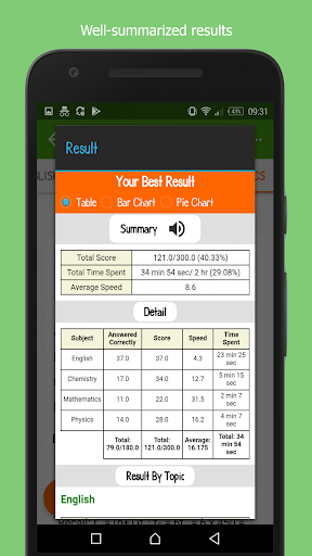 • Shows summarized and detailed result after practice in Tables and Charts.