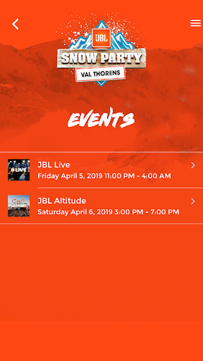 JBL Snow Party Event App with information on the program, artists, events, maps, hospitality and more