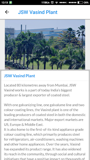 Vasind is the first manufacturing facility carries the legacy of one of the most illustrative Steel Company of the World, JSW Steel, a 11 billion dollor conglomerate (Part of OP Jindal group). The journey of the JSW group has started since 1982 with a sober beginning in putting up a Cold Rolling Mill at Vasind, which subsequently transformed into a full-fledged complex with Cold Rolling, Galvanizing, Galvalume and Colour Coating facilities. JSW Steel Coated Products is a largest Exporter of Coated Steel of the country having a significant presence in the geography of USA, Europe, Africa, Northern South America and Middle East.