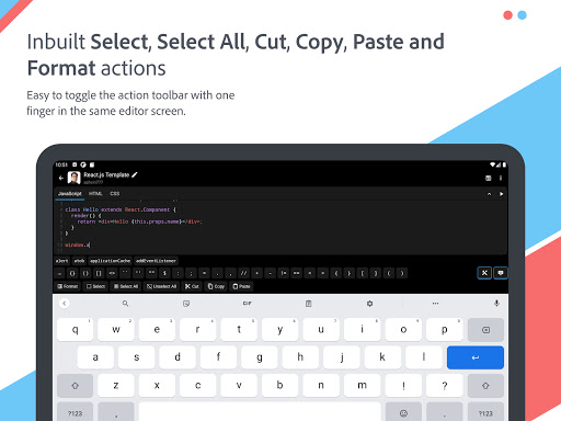 An advanced editor to write, test and share JavaScript, CSS, and HTML snippets in mobile phones and tablets. Below are the main features -