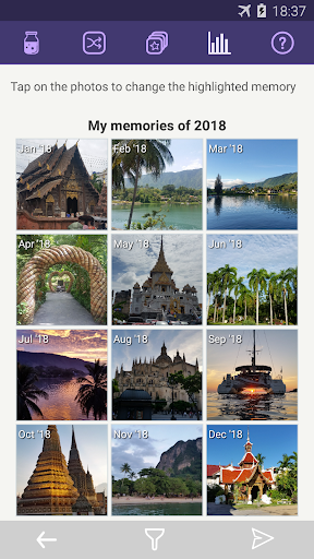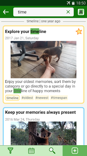 • cheer up your day by browsing some of your previous memories in a timeline, at random, filtered by category or similar dates