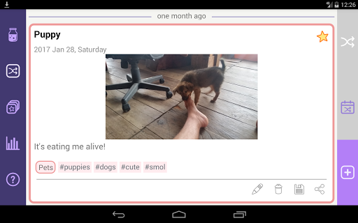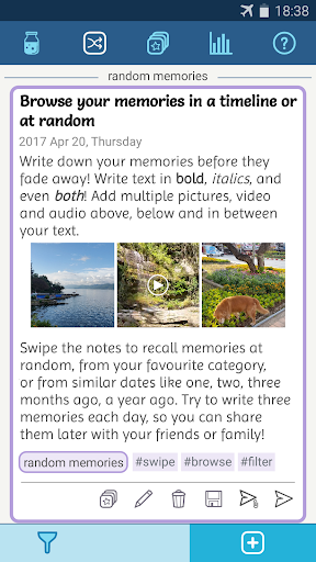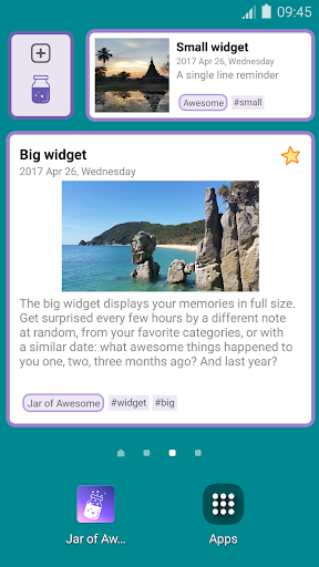 • keep your life memories fresh at all times: set an awesome widget in your phone's homescreen that shows all your favourite moments, or get reminders from time to time displaying the notes of your choice. And if you are afraid you will forget to write down your memories, you can also get a reminder for that!