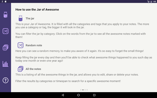 Life is mostly awesome, but we easily forget it. This Jar of Awesome app is a mindfulness diary for you to write down all those everyday events that made you feel good, that you are grateful for, that made you smile and brightened your day, so that you are more aware of them both when they happen and later when you recall them again while browsing all the notes in your jar. Pay more attention to your life and don't let your good memories fade away so fast!