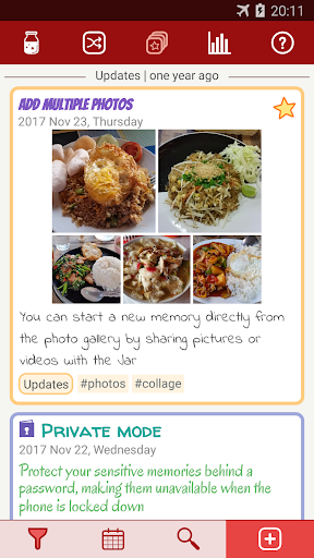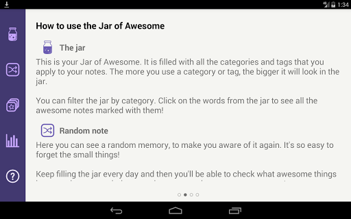 • cheer up your day by bringing back some of your previous memories in a timeline, be surprised at random, or filter them by categories or a similar date: do you remember what happened to you one, two, three months ago? One year ago? The more notes you write every day, the more useful the Jar of Awesome will prove to you!