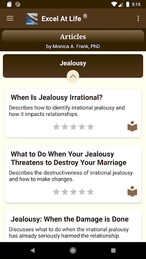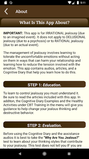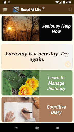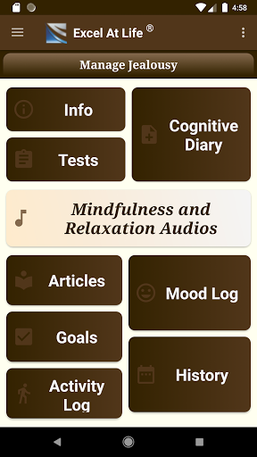 Jealousy CBT Tools by Excel At Life teaches you how to use the cognitive-behavioral therapy (CBT) methods in a simple format to learn how to manage irrational jealousy. The tools provided in this app are derived from the CBT research base and developed into a user-friendly format by a psychologist with over 30 years of clinical experience.