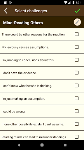 • Fully customizable: change the CBT terms (beliefs and definitions) used in the diary to conform with the system you are familiar with, add your own challenging statements for each belief, add moods/emotions, add healthy activities to track, change colors of app