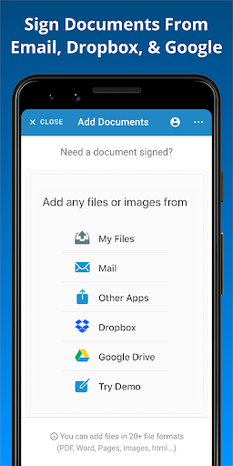 Add files from Dropbox, Google Docs & Drive, Microsoft OneDrive, Mail, and other apps to start signing.