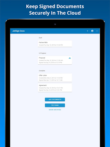 To share documents across devices and with other users, JetSign uses encrypted cloud storage in a secure US-based data center. View our Privacy Policy for full details at https://www.jetsign.com/privacy.