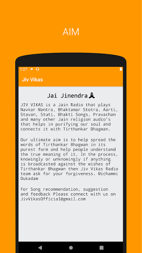 Jiv Vikas is a Jain Radio that plays Navkar Mantra, Bhaktamar Stotra, Aarti, Stavan, Stuti, Bhakti Songs, Pravachan and many other Jain religion audio's that helps in purifying our soul and connects it with Tirthankar Bhagwan.