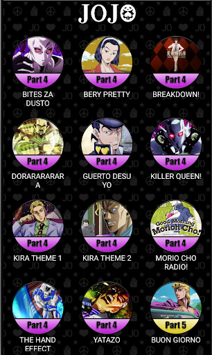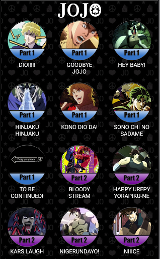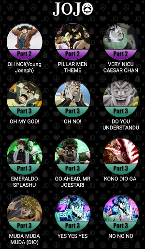 Soundboard to play memorable audio clips, voice lines, and visuals from the anime JoJo's Bizarre Adventure. Consists of sounds from parts 1-5.
