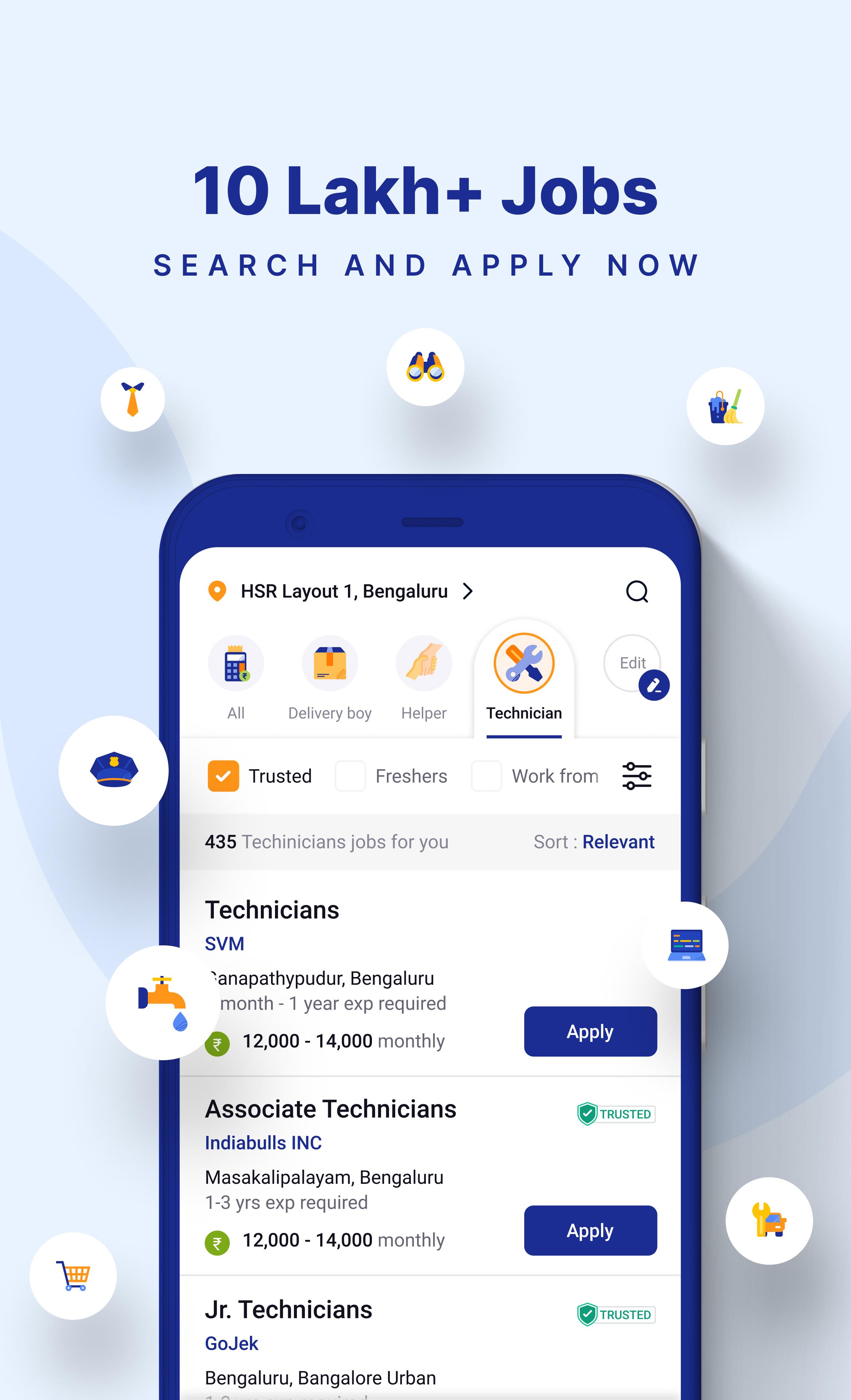 We have 5 Lacs+ jobs in Delivery Boy, Customer Care, Accountant, Back Office Executive, Cashier, Computer Operator, Data Entry, Driver, IT Support, Office Assistant, Sales/Business Developments, Technician etc. in cities like Bengaluru, Delhi, Mumbai, Chennai, Kolkata, Ahmedabad, Pune, Hyderabad and 100+ more cities.