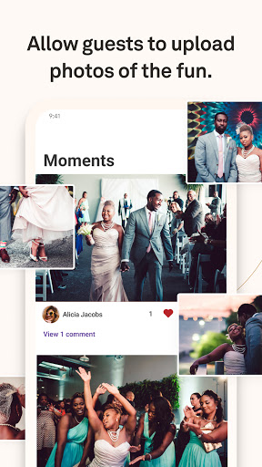A shared photo album allows guests to upload photos for everyone to relive wedding memories.