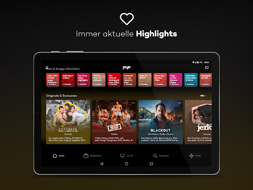 Du findest auf PLUS auch viel mehr Originals und Exclusives als auf der kostenlosen Version von Joyn, z.B. jerks., Reality Shore, Check Check, Frau Jordan stellt gleich oder Blackout. Auch das Angebot an Live TV ist mit über 70 Sendern, darunter acht Pay TV Kanälen wie Sport1 , Discovery Channel, Eurosport 2 und ProSieben Fun, deutlich größer.