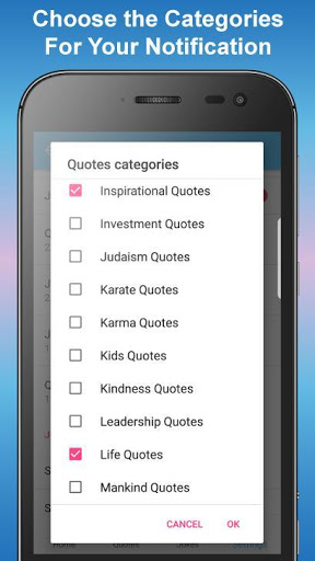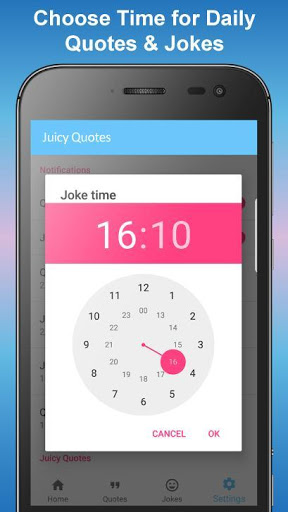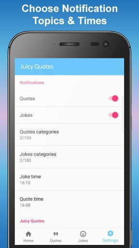 What makes our quotes and jokes app unique is that you can choose exactly what kind of notifications you would like. You can choose to get notified by exactly the categories you have selected for both quotes and sayings as well as jokes and puns. Even better yet you can choose exactly what time of the day you would like to receive a daily quote and daily joke.