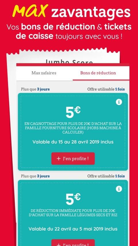 Avec la nouvelle appli Jumbo Score Max, fini les bons de réduction papier qui dépassent dans votre portefeuille. Fini les tickets de caisse perdus ! Faites le ménage dans votre portefeuille et profitez de tous vos avantages fidélité à portée de main !