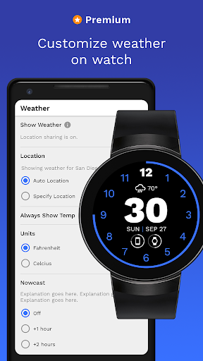 Weather: customize your integrated weather report with nowcast, auto-location, and temperature units (Fahrenheit, Celsius).