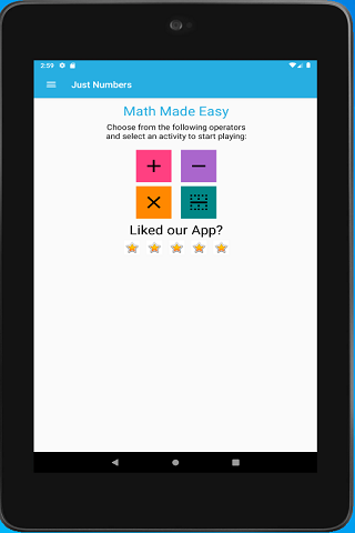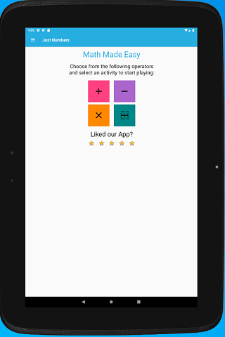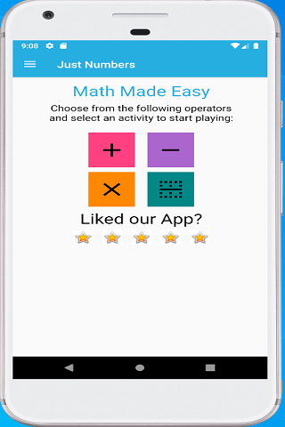 Math practice made easy. App to help build endurance by solving task without time limits. App's main screen displays 4 math operators to practice: