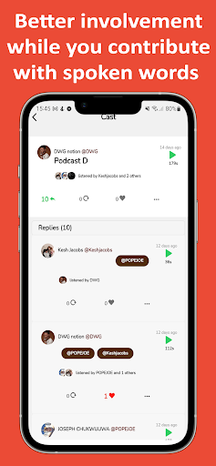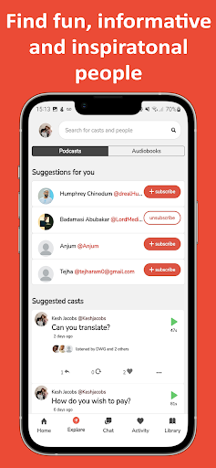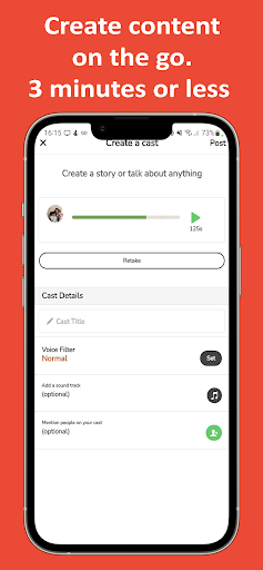 Social media just got a new cousin. audio only social media platform., JustTalk create short podcasts (3 minutes max) expressing yourself much better than you do on other platform. express yourself and reduce the chance of being misunderstood with your voice. With videos you may get camera shy and not express yourself to the fullest but with audio only, no one's watching. everyone is listening instead. they want to hear what you want to share. The JustTalk is the allows you upload short casts, lets you accumulate subscribers, likes and most importantly listeners. Less time on your phone screen, more time doing all the things you need to do while you indulge in various casts made by the people you've subscribed to. You could even go wild and check out our explore page and browse various users and their casts that you might find interesting. Many in app experiences to keep you entertained and the app fun, profile pictures, likes, voice filters, disappearing private messages and so on.