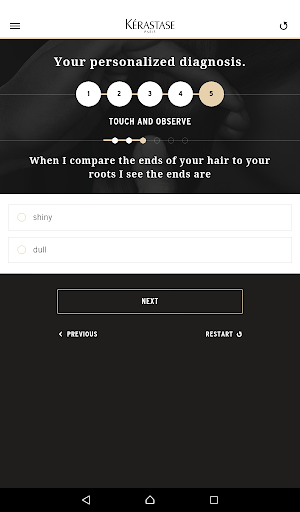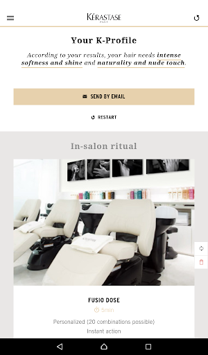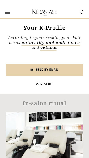 The application provides you a tool for a personalized diagnosis, to discover in few clicks which are the in-salon rituals and at-home programs the most adapted to each type of hair. Through a couple of questions, the application helps you to define which are the primary needs of your customers, and recommends the suitable Kérastase products.