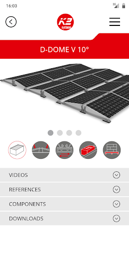 The app also provides relevant information of all K2 photovoltaic mounting systems. This includes technical data, demo videos, installation instructions, application examples, references and component illustrations.