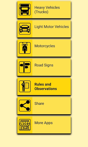 Driving Licence Practice Tests & Learner Questions - Heavy Vehicles (Trucks) - Light Motor Vehicles - Motorcycles - Road Signs - Rules and Observations - Share - More Apps