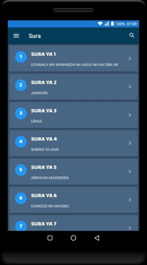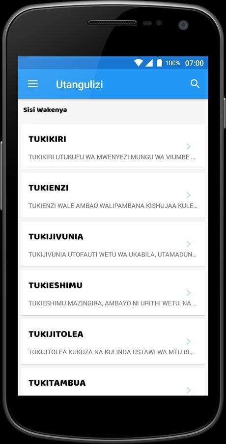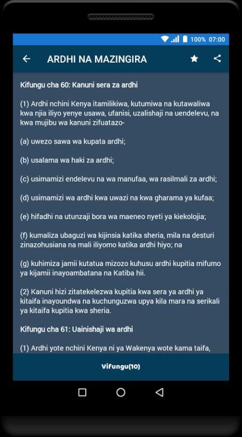 Katiba ya Kenya App iliyo kwenye mtandao wa Android ni toleo la Kiswahili la Katiba ya Kenya, inatoa maelezo yaliyo rahisi kusoma, yanayomwezesha mtu kutambaa katika sura, vifungu, na sehemu zote za Katiba, kwa njia rahisi. Haya yote yako kwa mara ya kwanza katika Android, kwa lugha ya taifa ya Kenya: Kiswahili.