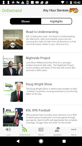 Listen live and on-demand to your favorite KSL Newsradio programs; Utah’s Morning News, The Doug Wright Show, The JayMac News Show, The Nightside Project, The KSL Movie Show, KSL Greenhouse, Cougar Sports Saturday, and more. Plus catch shows exclusive to the app, including SLC Fanboys, BYU Cougar Tracks and more.