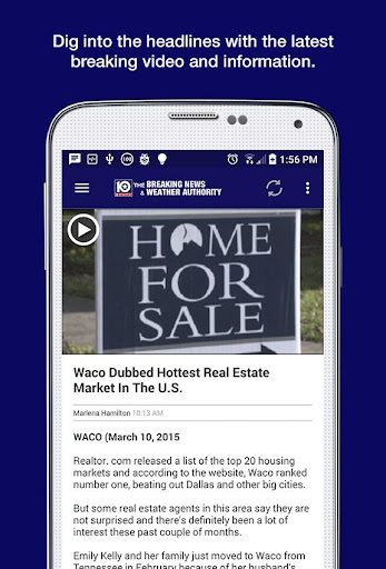 It’s the Central Texas news experience you’ve waited for! Catch news, sports, and weather anywhere with the KWTX app for Android. Share content by email, text, Twitter or Facebook. Whether it’s severe weather or sports scores, the KWTX app for Android keeps you in-the-know while you’re on-the-go!