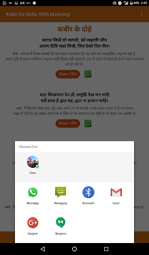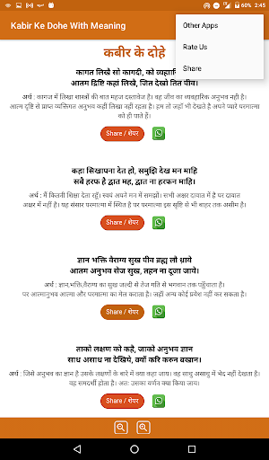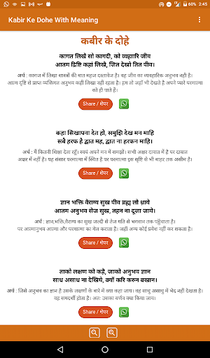 Kabir Das Ji was a Indian mystic poet and saint (15th-century). His verses are found in Sikhism's scripture. Kabir Das Ji was from in a Muslim family. Kabir Ji was strongly influenced by his guru(bhakti Ramananda). Kabir Ji composed poems in earthy style and pithy.This App has the advantage of doing the regular Kabir Ke Dohe With Meaning( कबीर के दोहे अर्थ सहित ) on your mobile and tablets.