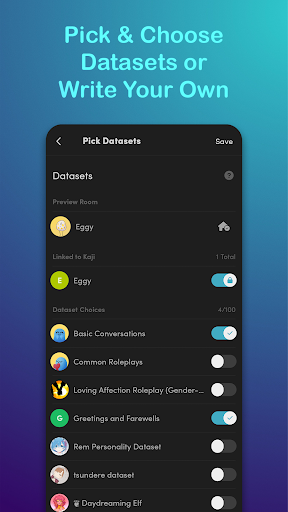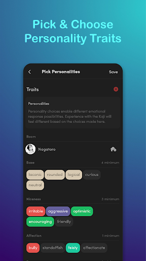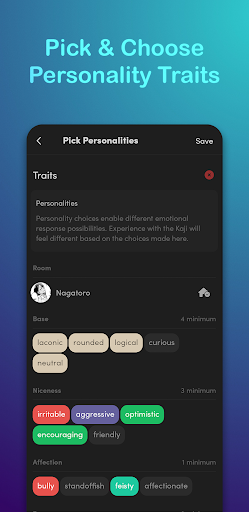 The AI allows Kajis to communicate by connecting words in your sentence and your previous sentences. You can improve the AI and influence its personality by training it.