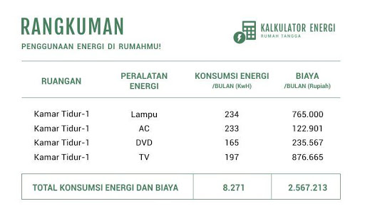 Kalkulator energi rumah tangga adalah aplikasi yang bisa kamu gunakan untuk menghitung biaya energi peralatan elektronik di dalam rumahmu. Dengan aplikasi ini kamu dapat mengetahui seberapa efisien penggunaan energi di dalam rumahmu.