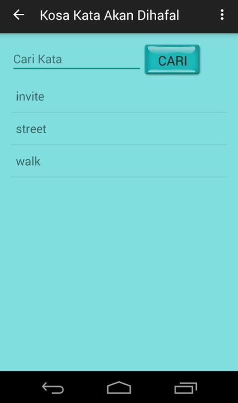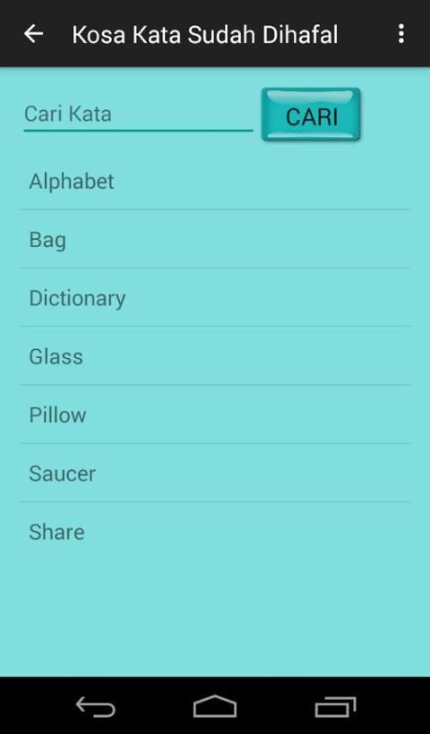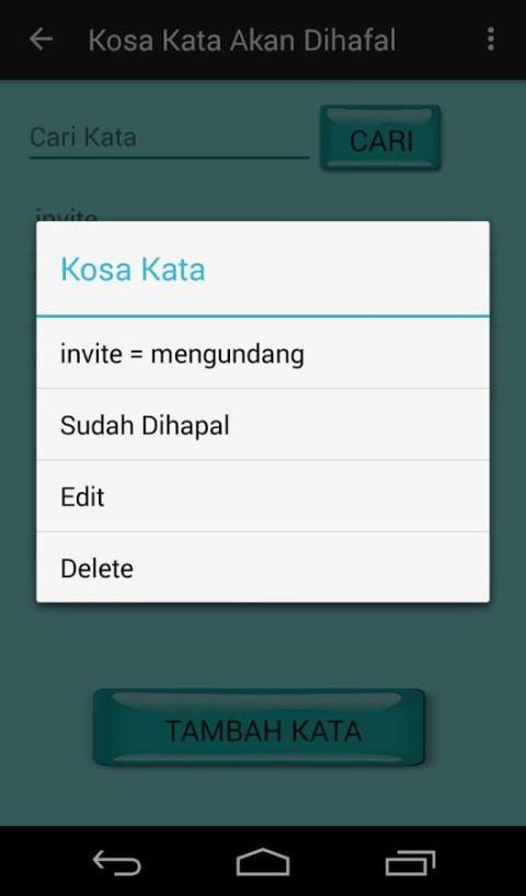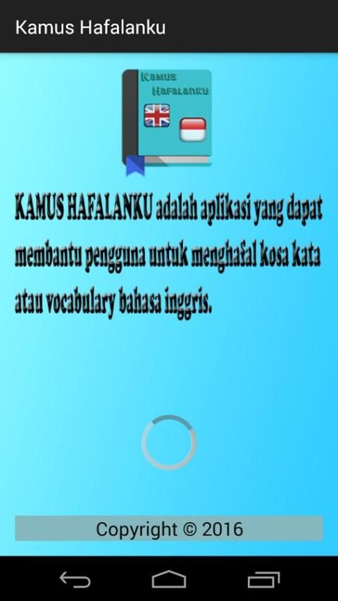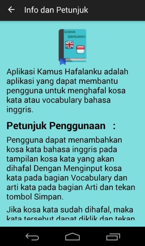 Dictionary Hafalanku is android based application that serves as a reminder of time memorizing English vocabulary. You can enter the vocabulary of the English language to be memorized. In a certain period, the notification will appear as a reminder to re-memorize English vocabulary. The vocabulary that has been memorized can be moved to form the vocabulary memorized. This application does not require to enter the vocabulary memorized because it will not be displayed if the memorization time to appear, but it can also be added. This application is highly recommended to anyone who wants to memorize the vocabulary of the English language. Can also be used as a dictionary if you want to look for the English language vocabulary or Indonesia because Hafalanku Dictionary application also has a dictionary in it.