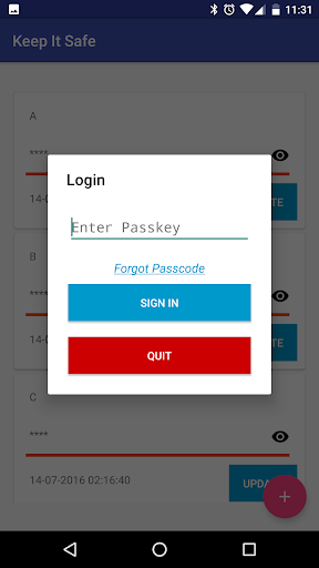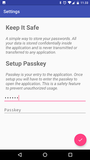 A simple way to store your passwords. All your data is stored confidentially inside the application and is never transmitted or transferred to any application.