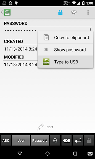 To type password, connect your phone to your computer using USB and open desired password entry. You can tap on the overflow menu (3 dots at top right) to type username/password with tab as seperator or tap on any field to send just that field.