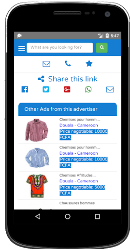 Its idea is based on the African marketplace concept where everyone can buy and sell any legal goods in a convivial atmosphere. We provide the platform and interface to advertise, share and sell any product and article, new or second hand. It is the best place for finding and buying goods in your area.