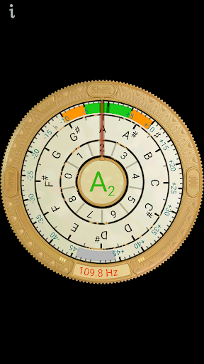 The inner dial shows the octave. The outer dial will show if the note is flat or sharp - The orange region is within 10 cents for good tuning, the green is within 5 cents for more accurate tuning.