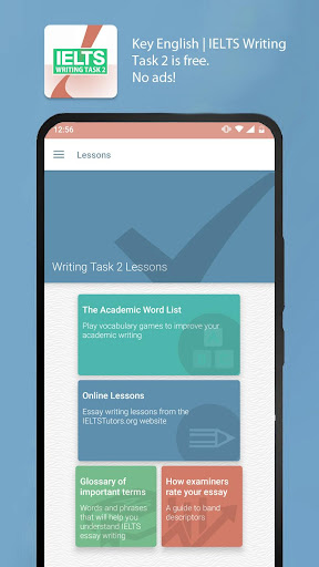 This app contains no ads and all its features are free. If you want to support us, you can make an in-app donation or pay a small fee to have your essays marked with feedback emailed to you by our experienced IELTS teachers.
