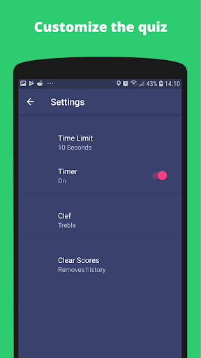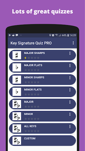 To help train, you can choose from a variety of different quizzes. For each quiz you are given a limited amount of time to guess each key signature. If you wish you can focus on just major/minor signatures or on sharps/flats.
