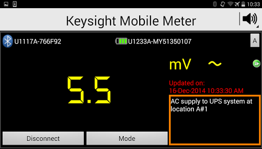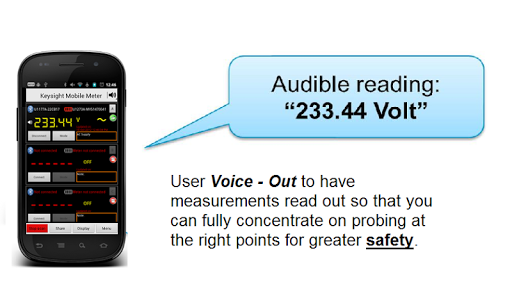 Keysight Technologies Remote Link solution improves your work efficiency and safety. Connect wirelessly to your Keysight U1200 series handheld digital multimeters or clamp meters via Bluetooth® wireless technology. The Keysight Mobile Meter enables you to view measurements from up to three Keysight handheld meters, extending your reach wirelessly to multiple points from a single location. Make measurements from a safe distance and eliminate the need to walk back-and-forth between measured points and control panel during trouble shooting. To further enhance safety during the probing of high-voltage circuits, the Keysight Mobile Meter includes a “voice-out” capability. This feature provides an audible output of your handheld meter readings through the text-to-speech engine in the Android device so that you can concentrate on the measurement task.