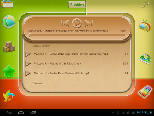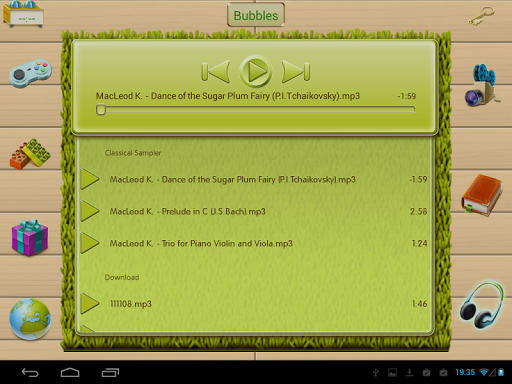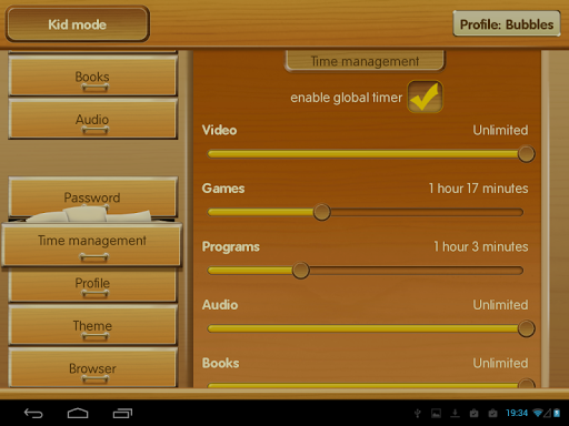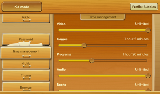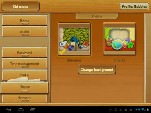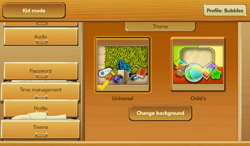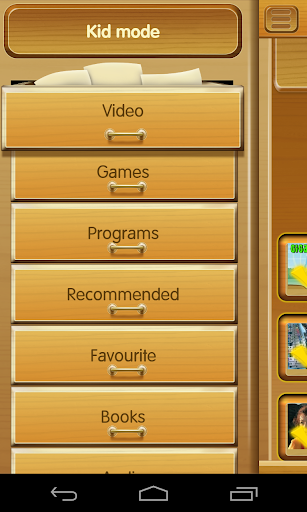 All the children's content is collected in one place and conveniently organized by category. "Kid's Way" creates a secure children's world in Android-device, where only approved games, applications, books, cartoons and music are placed. Within a virtual child's room child totally independent, but the Child Lock blocks all unwanted actions of the child, including the purchase, download, change settings, delete files and making calls.